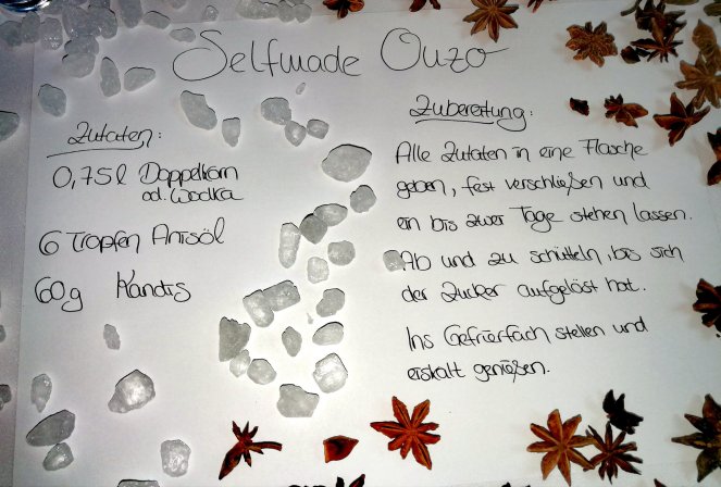 Die Anleitung habe ich euch als Bild beigefügt. Ich wünsche euch viel Spaß beim süffig Ouzo herstellen und natürlich ganz besonders beim verkosten.