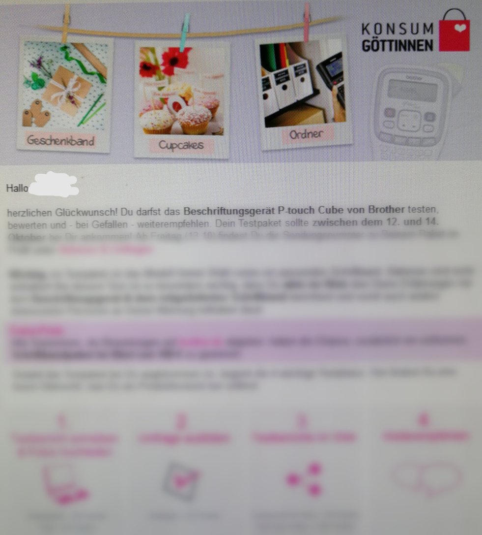 Meine lieben, E-Mails die mit den Botschaften, der eben erhaltenen E-Mail in meinem Postfach landen sind einfach die aller schönsten. Ich habe mich erfolgreich auf der Seite Konsumgöttinnen.de für den Produkttest eines brother Beschriftungsgerät beworben und hierfür soeben die Zusage erhalten. Juhuuuu, ich habe die Ehre den brother P-touch Cube zu testen und euch ausführlich… Weiterlesen Jubelstimmung und Freudentanz